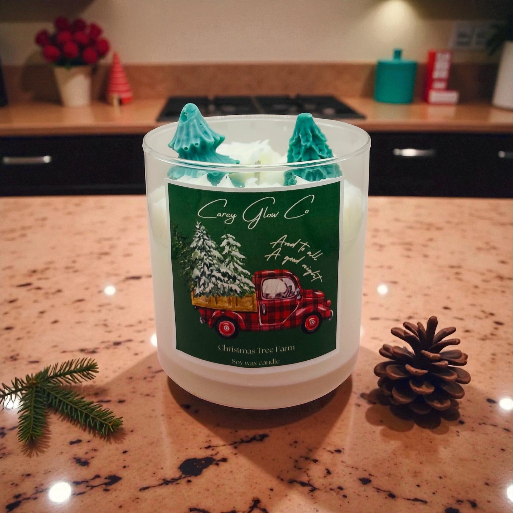 Notes are balsam and fraser fir. Topped with a green tree embed.