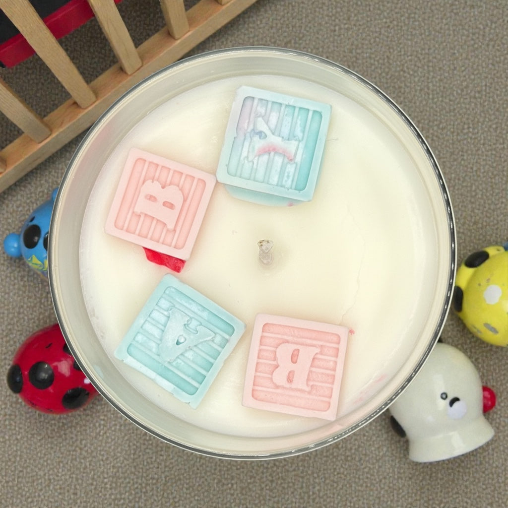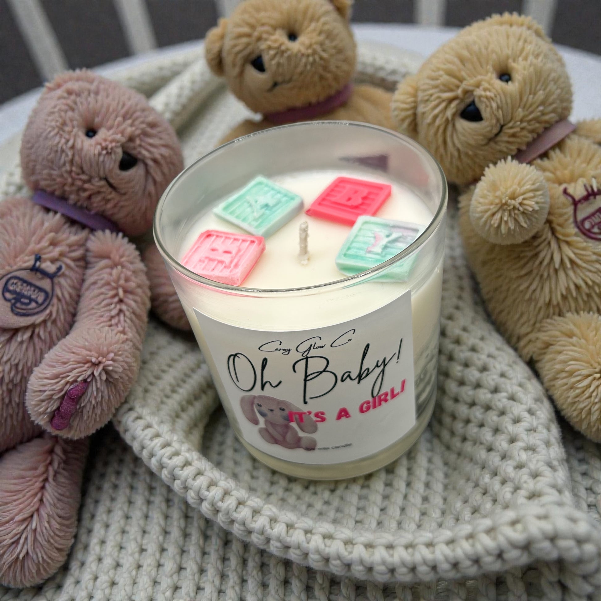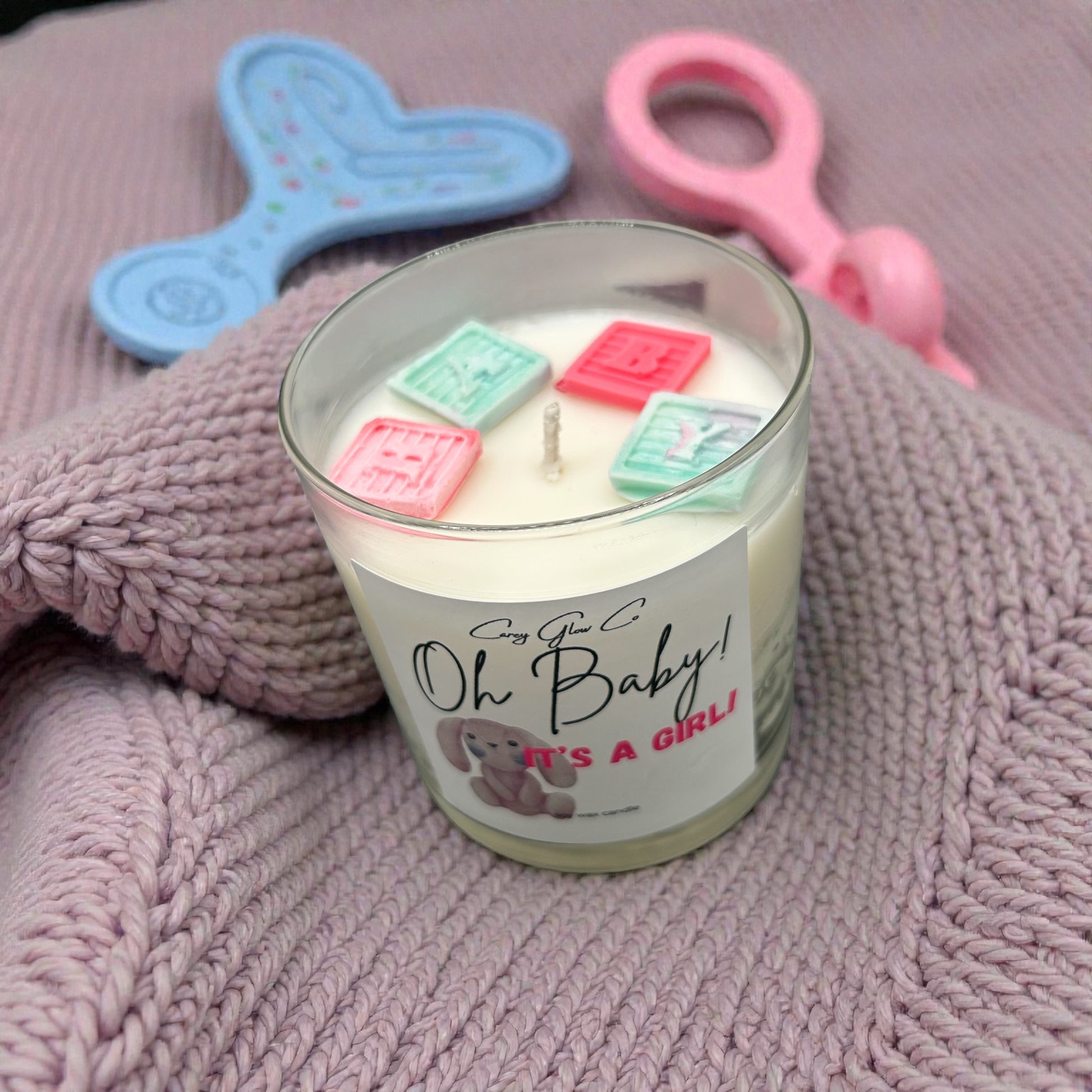 Celebrate your bundle of joy with this baby powder scented candle! Beautiful handmade decor color coordinated in either pink or blue!! Perfect as a gift for an expecting couple or as a beautiful way to announce your little one.